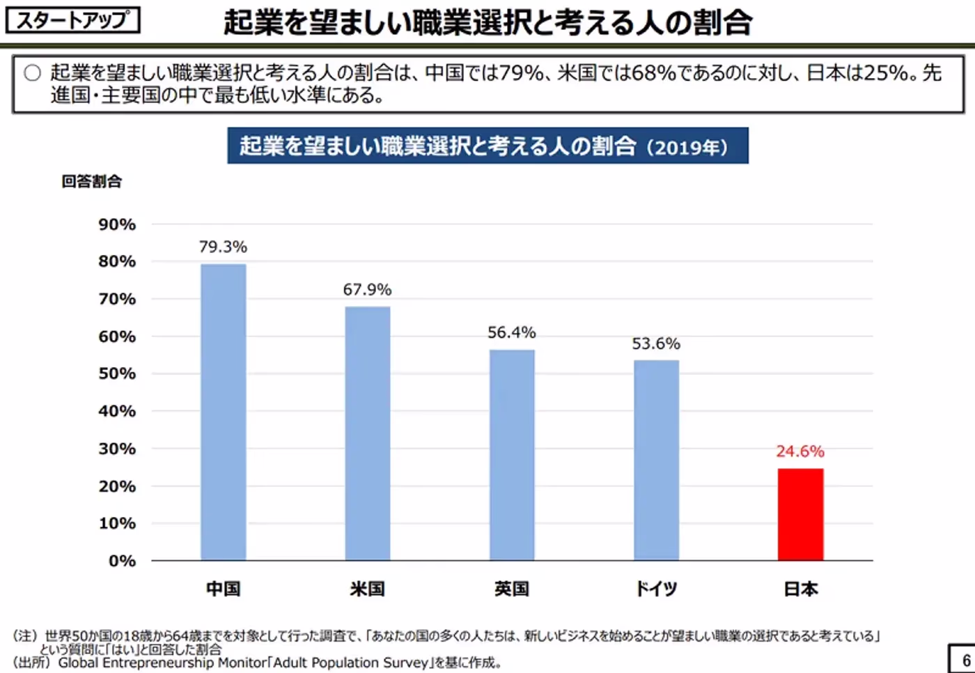 世界各国と比べると、日本は起業に積極的な人が少ない傾向にあります。「起業を望ましい職業選択と考える人の割合」は、中国が79.3%、米国が67.9%なのに対し、日本は24.6%と最も低い水準となりました。