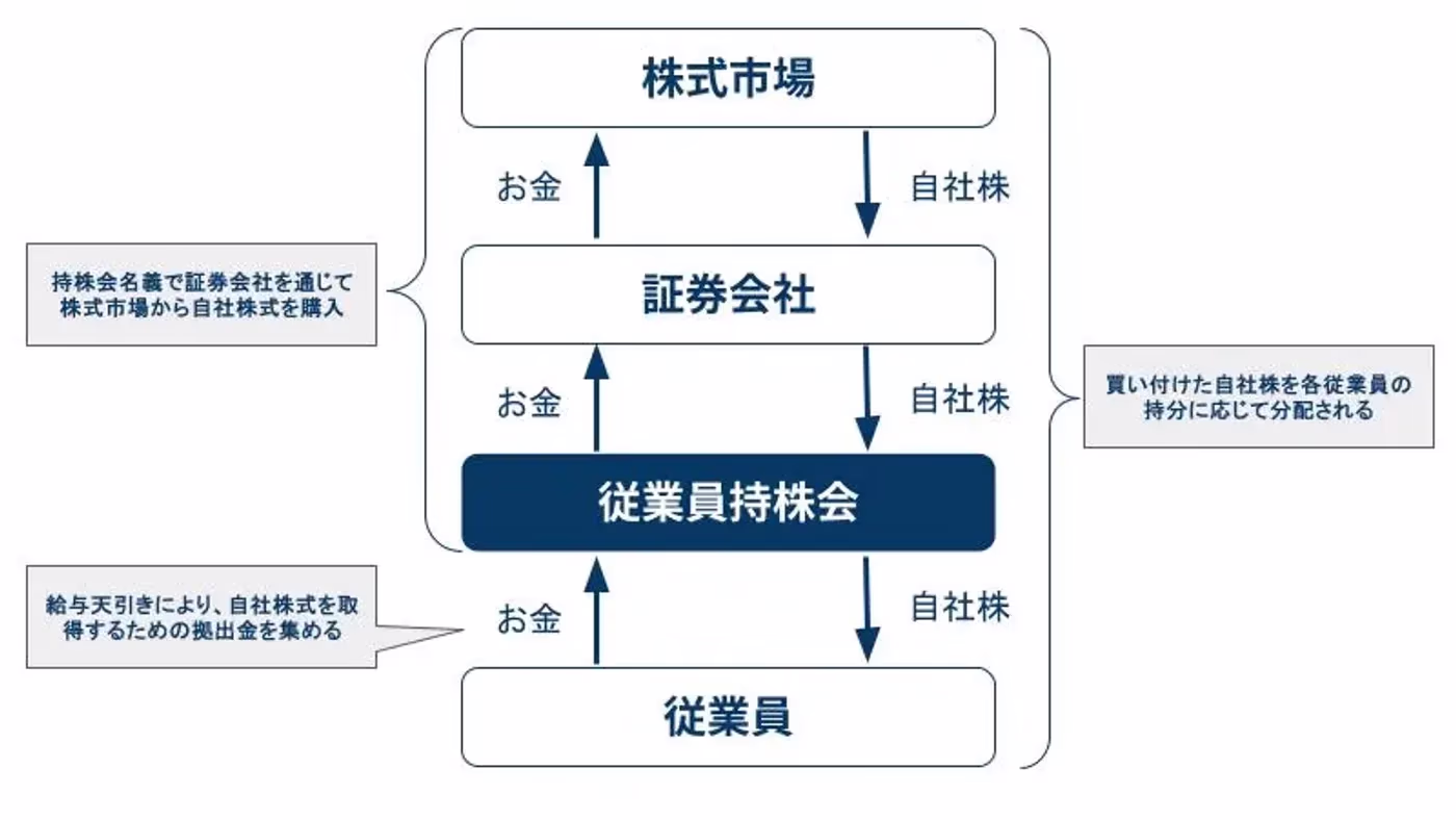 従業員持株会の基本的な仕組みは、給与天引きによる積立と定期的な株式購入です。具体的には以下のとおりです。