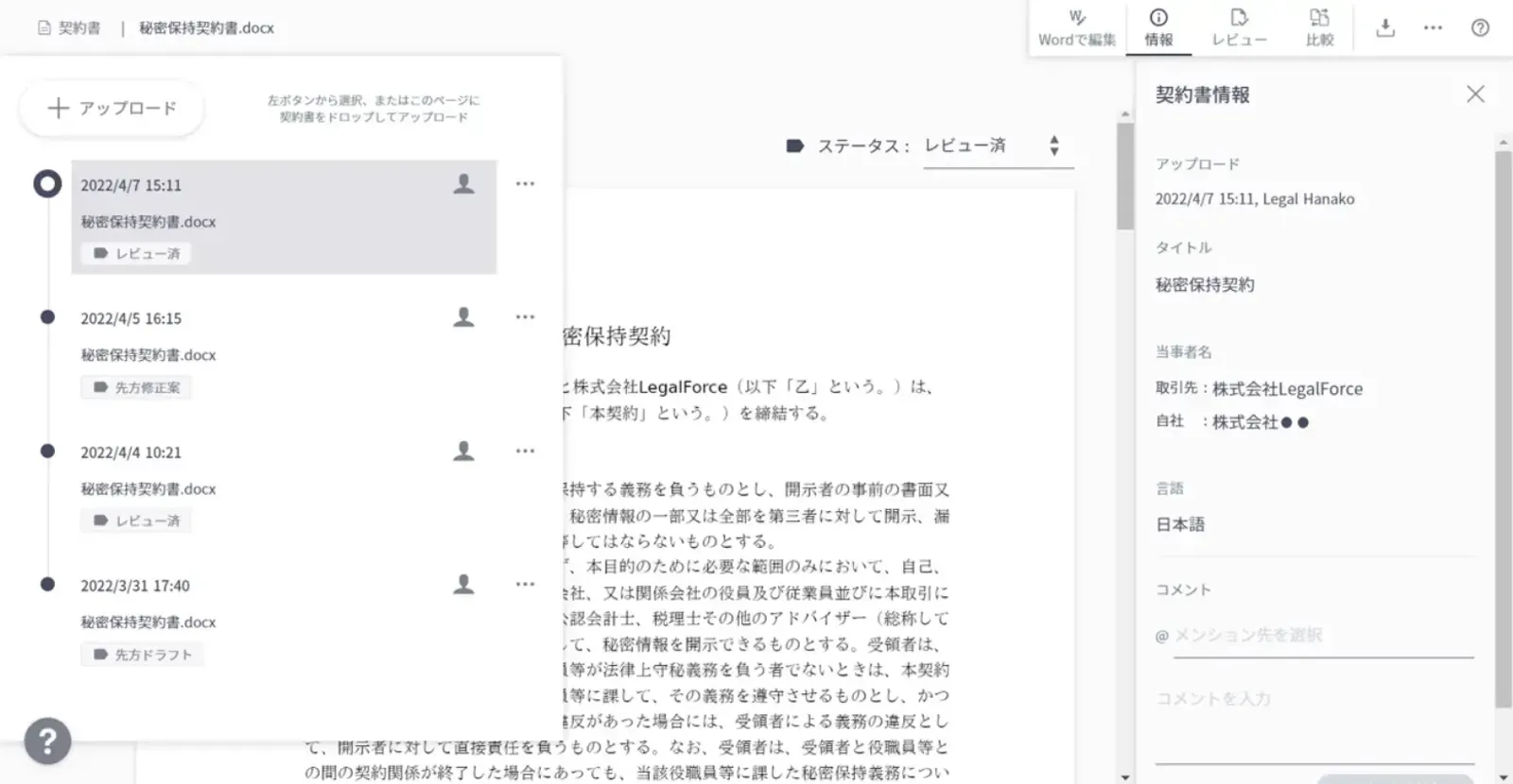 また、「バージョン管理」はプライバシーマーク関連の業務で重宝しています。個人情報の取り扱いについての内部規程がいくつかあるので、これをLegalForceにアップロードして、更新時にこれまでのバージョンの遍歴が確認できるようにしています。