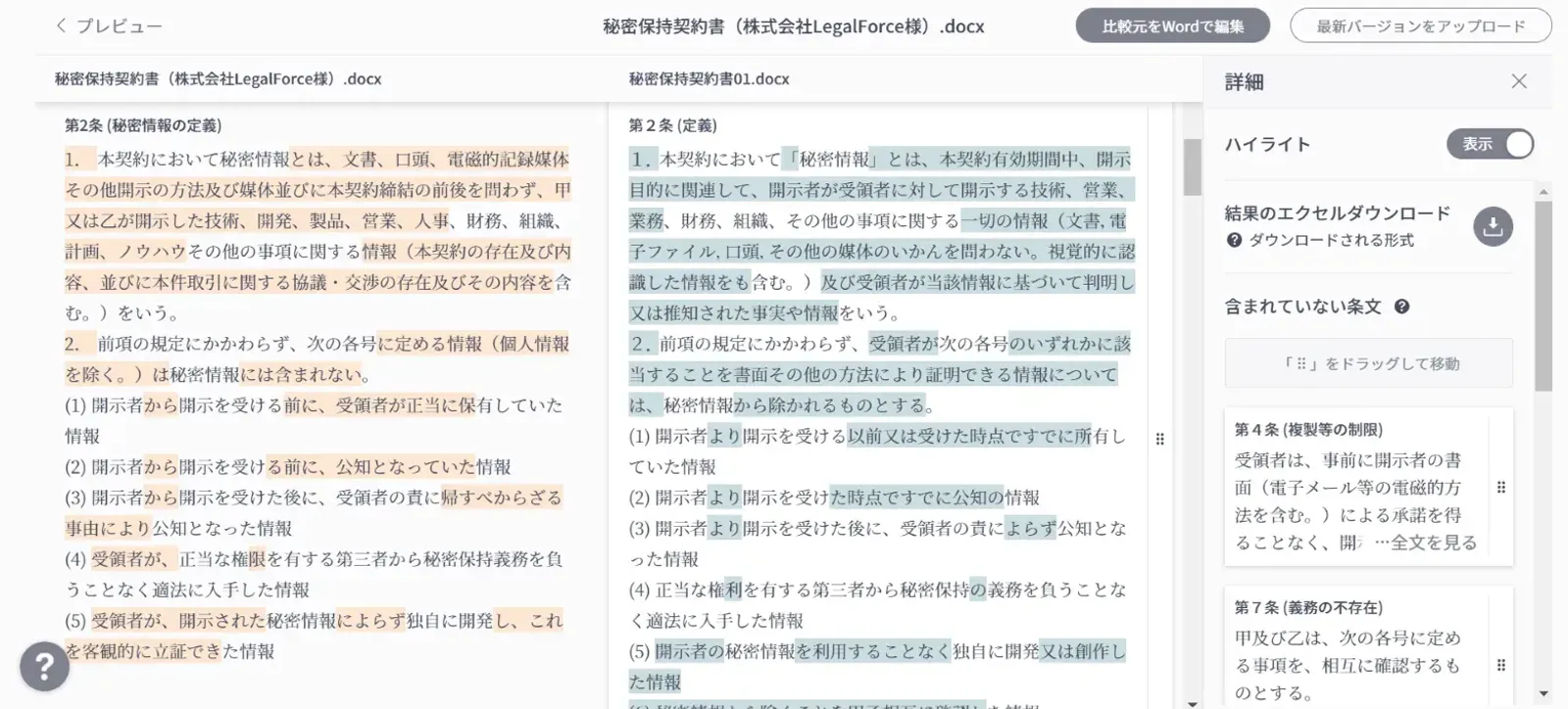 西村様 当社は広告関連の契約や地方自治体向けの自動販売機の設置に関する契約など、毎年更新する契約が多いのですが、その際にも比較機能が役立っています。契約更新時に相手方から前回の契約書をデータで受領し、LegalForceにアップロードして新旧比較を行っています。人間だと発見しづらい細かな変更点でも、LegalForceなら見落とすことがないので心強いです。