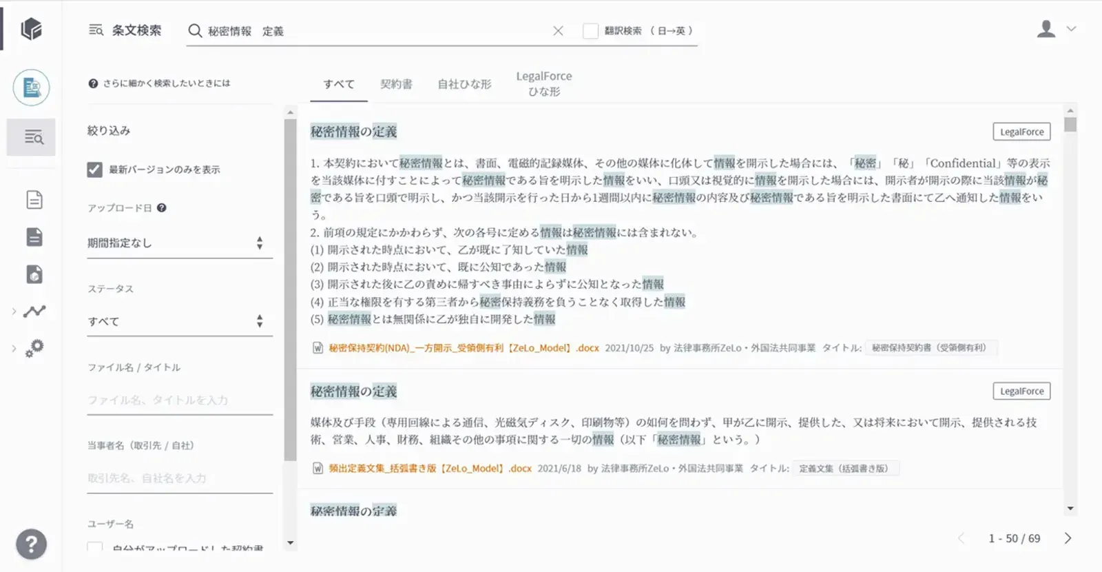 キーワードを入力すると過去の契約書やひな形から条文を検索できる