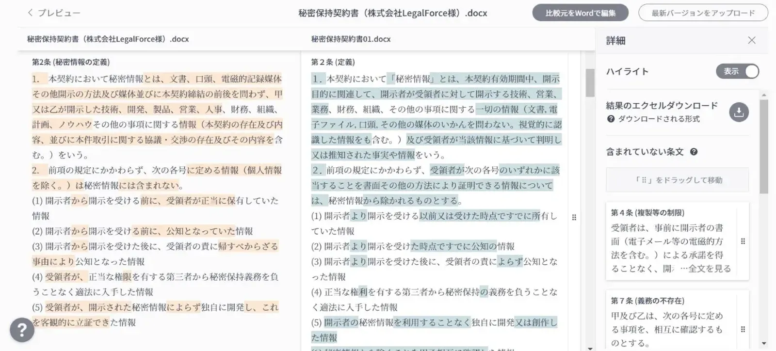 比較機能を使えば、このような「9割は同じだけれど残りの1割が違う」といった契約書を扱う際に、自分の力で一から照らし合わせる必要がなくなります。どんなに気をつけても見落としてしまいそうなわずかな差異でも、LegalForceはしっかりと拾い上げてくれるので助かっています。比較ができるだけでも、約5割の作業時間を短縮できていると感じます。