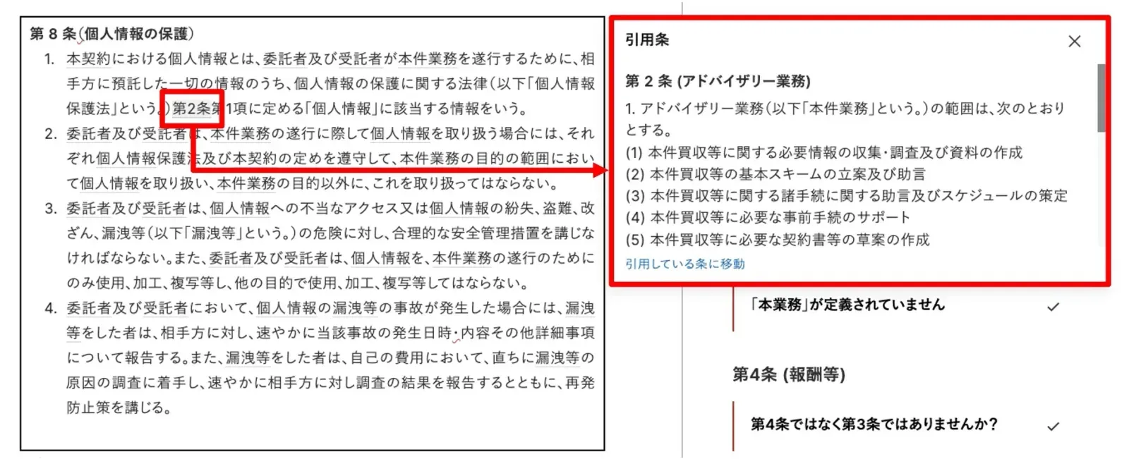 また契約リスクチェック機能にかけると表示される「サンプル文・関連情報」も重宝しています。クライアントに対して修正箇所をフィードバックする際、その根拠として示す情報の参照元として使っています。